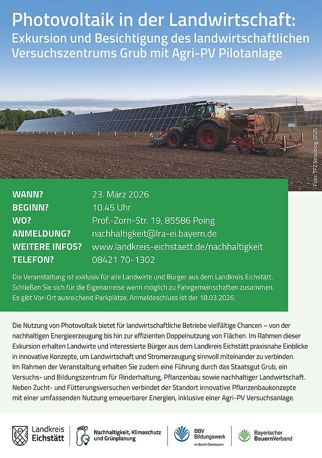 Hiermit möchten wir Sie recht herzlich zur Exkursion mit dem Thema „Photovoltaik in der Landwirtschaft - Exkursion und Besichtigung des landwirtschaftlichen Versuchszentrums Grub inkl. Agri-PV-Pilotanlage“ am Montag den 23.03.2026 einladen.
